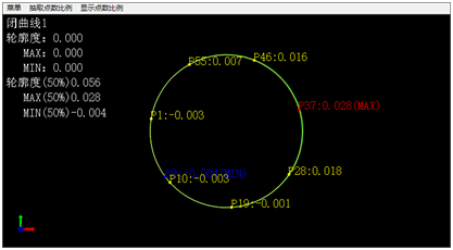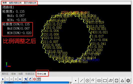 4. 测量轮廓度数据查看及导出:右键选择闭曲线,点击形状公差图,即可在形状公差区域查看轮廓度结果。在菜单中可以将结果导出为excel报表,抽取点数比例和显示点数比例均可以调整。