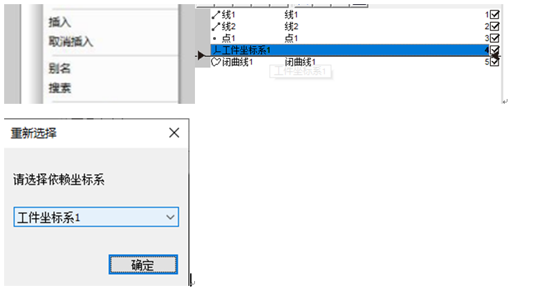 4.插入坐标系:在线2后插入坐标系,之后对于同型号的产品就不再需要进行上面步骤,只需要找到坐标系即可。在线2后右键点击插入,以线1、线2构造坐标系,建立完成之后,选择曲线右键点击重设依赖坐标系,选择以线1、线2构建的坐标系,点击确定即可。最后点击取消插入即可。