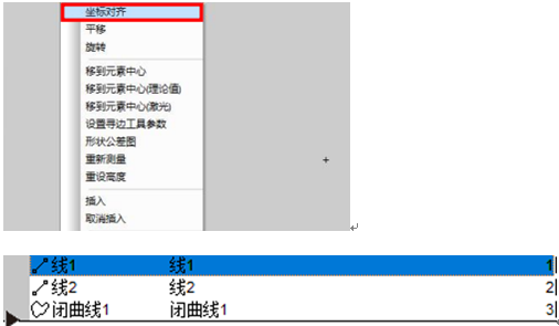 2.坐标对齐:数模文件导入之后其位置与实际产品的位置会存在一定偏差,因此需要进行对齐。在元素区右键选择坐标对齐,之后在元素区选择相对应的线1,在影像区测量实际线1位置,之后再依次测量线2的位置。