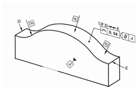 以下三维图是根据GB/T1182-2018产品几何技术规范(GPS) 几何公差、形状、方向、位置和跳动公差标注。下图曲面线轮廓度为平行于A平面与这个零件相交的到的轮廓要素,又根据辅助框标注的UF D E,我们知道是需要测量从D到E这条线轮廓度。其公差带是包络一系列直径为公差值0.04的圆的包络线之间的区域,圆的圆心位于理论轮廓线位置上。