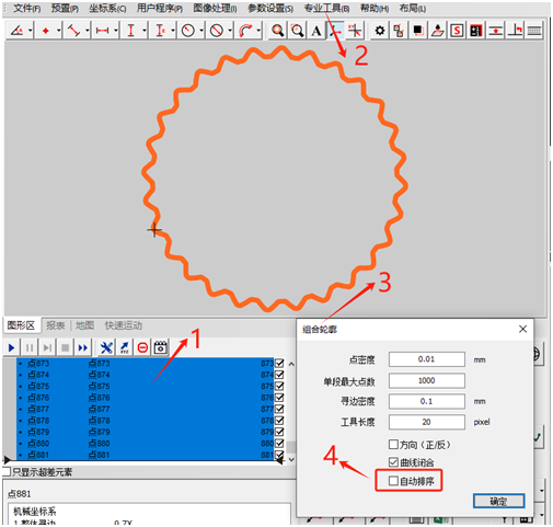 2. 组合轮廓:以上步骤采集到是点集形成的轮廓,并不是一条曲线,因此需要通过组合轮廓形成一条完整的曲线。在软件中将采集到的所有点全部选中,选择专业工具中的组合轮廓,将自动排序勾选上,点击确认即可生成一条完整的闭曲线,并将之前产生的点集全部删除。